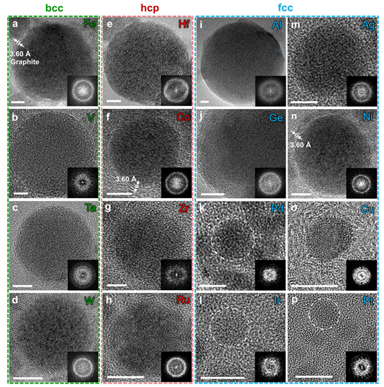 为了证明该方法的普适性,作者系统地研究了玻璃化更多单原子金属的可行性,包括具有bcc、hcp和fcc晶体结构的金属。应用这种方法,作者将十几种(总共17种)单原子金属玻璃化成玻璃态,并获得了各种MM GNP(图2)。图2a-d分别显示了bcc金属铁(Fe)、钒(V)、Ta和钨(W)的结果,也可以通过其他方法进行玻璃化7、11。图2e-h显示了分别由hcp金属铪(Hf)、钴(Co)、锆(Zr)和Ru玻璃化的MMG纳米颗粒。图2i-p显示了由fcc金属生产的更多MMG,包括主族金属(铝(Al)和锗(Ge))和过渡族金属(Pd、铱(Ir)、银(Ag)、Ni、铜(Cu)和铂(Pt))。