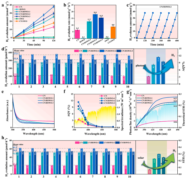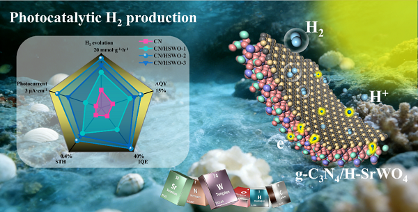 光生载流子的高效分离是开发高性能太阳能驱动制氢光催化剂的关键挑战之一。针对这一问题,研究人员构建了一种由H₂退火处理的SrWO₄(HSWO)与g-C₃N₄(CN)组成的Z型异质结光催化体系,以提升太阳能制氢性能。通过H₂退火处理,在SrWO₄中引入氧空位缺陷,有效调控了材料的电子结构,提高了光生载流子的浓度并延长其寿命,从而为后续反应提供了丰富的电子储备。在此基础上,HSWO与CN复合形成Z型异质结界面,实现了光生电子与空穴的定向迁移与高效分离:HSWO中的光生电子与CN中的空穴在界面处复合,而保留在CN导带中的电子则参与析氢反应,HSWO中的空穴则维持强氧化能力。该机制在保证高效载流子分离的同时,兼顾了体系的强氧化还原能力。性能测试结果表明,所制备的CN/HSWO复合材料在模拟太阳光照射下表现出优异的析氢性能:产氢速率达18.01 mmol·g⁻¹·h⁻¹,表观量子效率为11.4%,太阳能制氢效率为0.29%。该研究显示,将Z型异质结构建与缺陷工程相结合,能够显著提升光催化体系中载流子的利用效率,为开发高效稳定的太阳能制氢材料提供了新思路。该文章第一作者为辽宁大学2023级博士研究生赵宏铭,通讯作者为物理学院范晓星教授、陶然副教授。